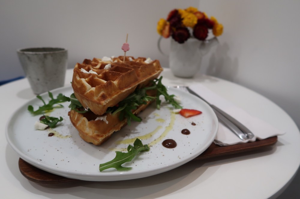 I ordered the “Dolly Purrton”, which was a savory spin on waffles! Between two Belgian waffles was a smothering of goat cheese, arugula, and strawberries (oh my!), all drizzled with a balsamic vinaigrette.
