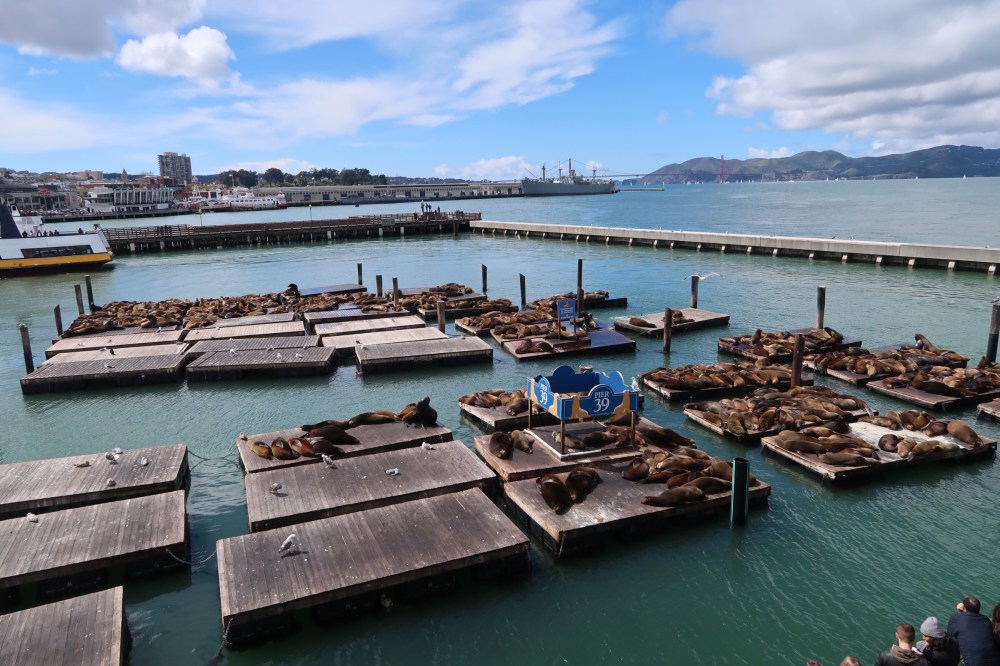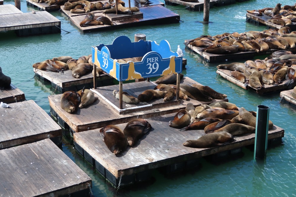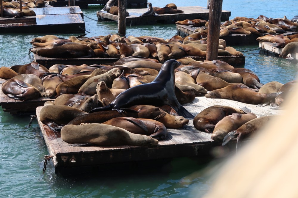 After my delicious meal, I wandered around the pier, drinking in the sugar-scented air and the yearned-for sunshine. I meandered around different shops, bought a honeysuckle perfume that took me back to the bush that grew by my old Virginia home, and eventually found myself facing a whole bunch of seals.