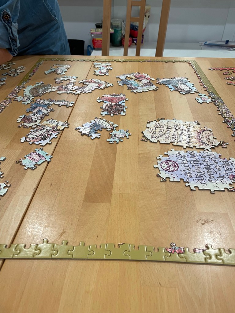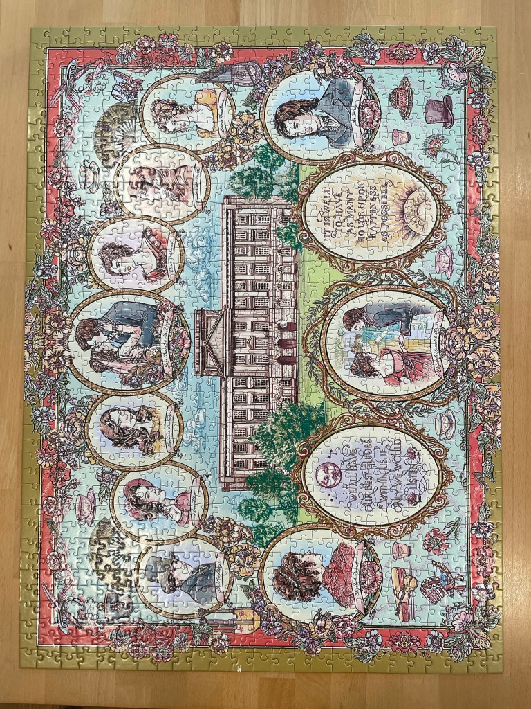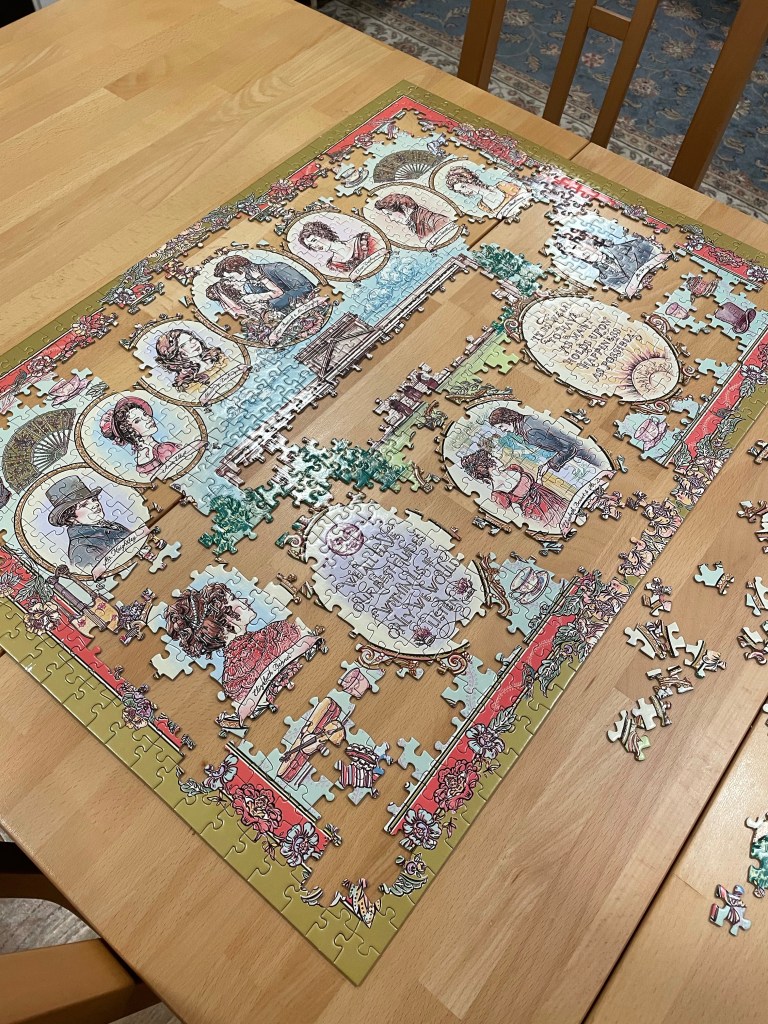 Over the weekend, we started a 1,000 piece puzzle I found at TJ Maxx. It has a beautiful design on it, made up of several different Jane Austen characters on it from “Emma”, “Pride and Prejudice”, “Sense and Sensibility”, and “Persuasion”.