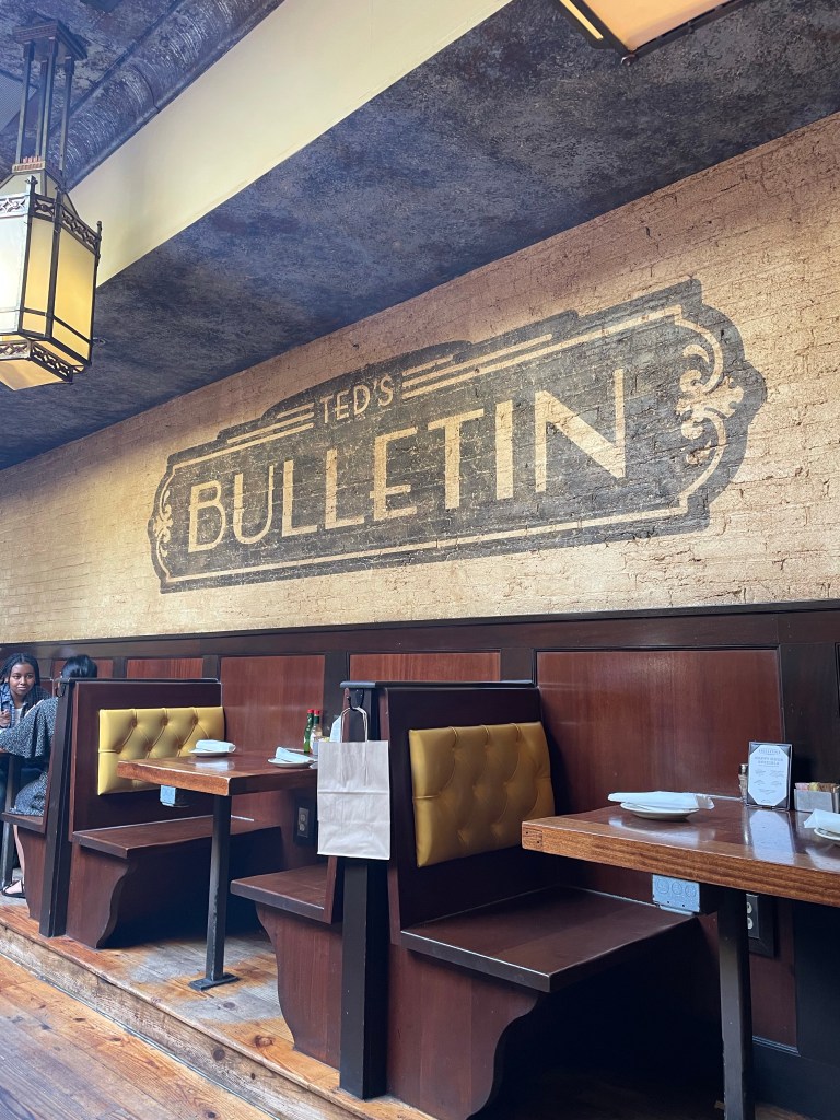 We decided to meet at 11 AM at Ted’s Bulletin (third time visit for me!), so I got us a table a little before then. Poor Melissa got held up in traffic, so I made use of the time by chipping away at my book and sipping on a cup of coffee. I think the staff thought I was being stood up on a date, as it was an hour after taking my seat that Melissa arrived.