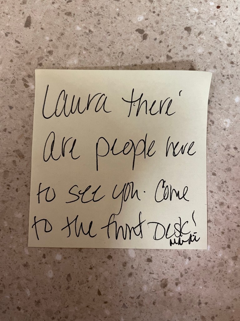 After a moment or two of pondering, I decide to walk up to the front desk to ensure that this note wasn’t meant for me.